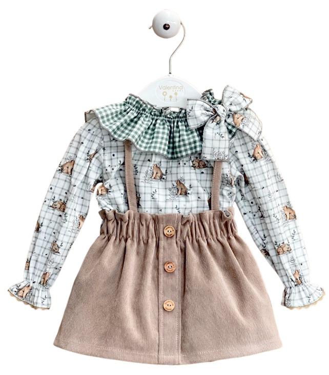 Pichi de pana fina en color arena, con goma en la cintura y tirantes finos .Botones imitación madera a modo decoración en la zona de la falda . Camisa de cuadros en color verde sobre fondo blanco y estampado de osos . Cuello con volante en estampado de vichy verde y blanco , con un lazo a un lateral en el mismo estampado que la camisa.