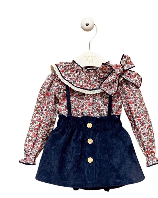 Conjunto tres piezas para niña de Valentina Bebés de la colección Borgoña formado por falda con tirantes de micropana color azul marino, culote a juego . Lleva adorno de 3 botones tipo madera en parte delantera de falda. Camisa de manga larga estampada con florecitas en tonos rojos y granates con gran volante en el escote ribeteado con puntillita beige y con un lazo estampado en escote