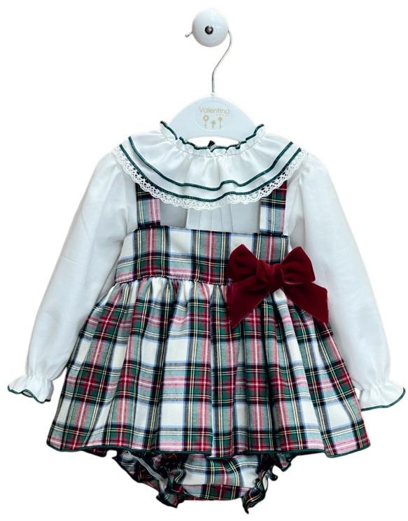 Conjunto tres piezas para niña de Valentina Bebés de la colección Chanel formado por falda con tirantes de estampado de cuadros escoceses en tonos blanco verde y granates, culote a juego. Lleva adorno de lazo en terciopelo granate en la cintura de falda. Camisa blusa de manga larga en color blanco con gran volante en el escote ribeteado con puntillita beig y con ribetes en color verde botella