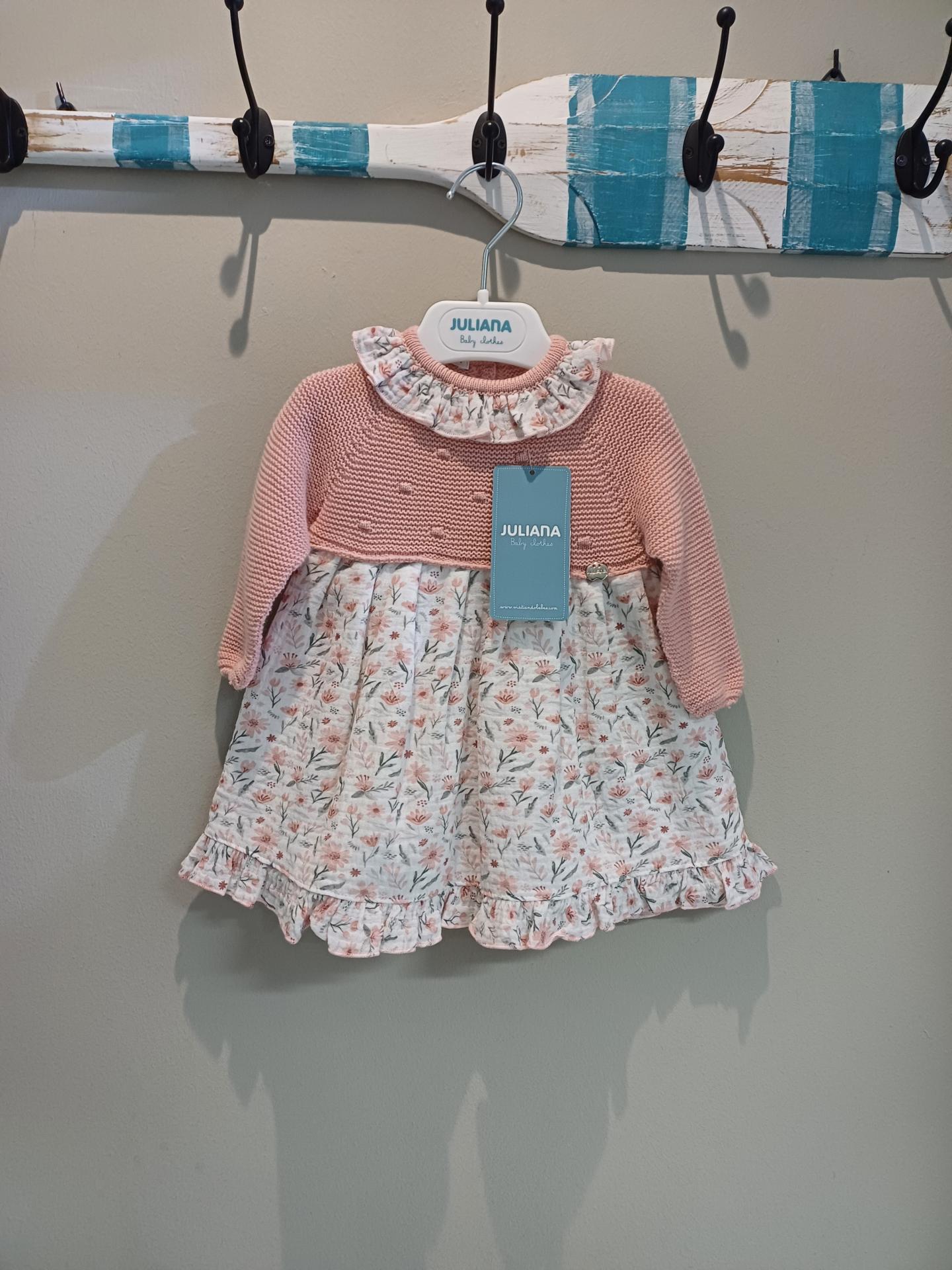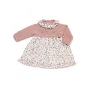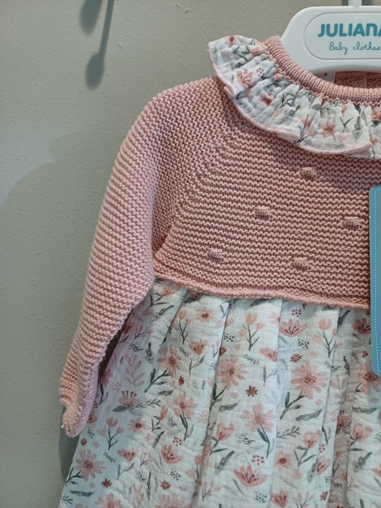 Vestido para niña de manga larga con cuerpo de punto en color rosa . Cuello con volante en el mismo estampado que el cuerpo . Detalle de bodoques en la zona del pecho . Falda en estampado de flores en tonos rosas y verdes , terminando en un volante .