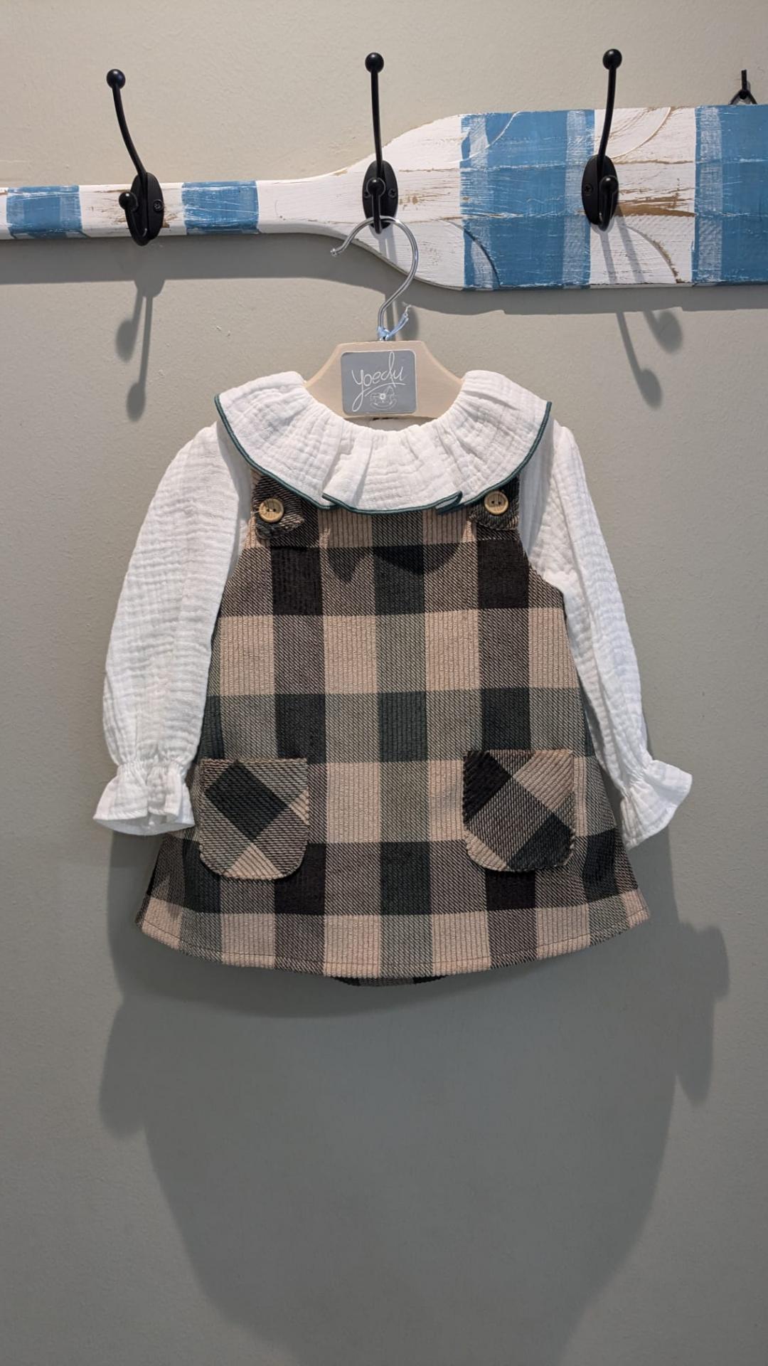 Conjunto de tres piezas de la Familia Angora de Yoedu , formado por un pichi en tejido de pana en estampado de cuadros grandes en verde musgo y camel , bolsillos en la parte delantera y botones de imitación madera en los tirantes .Blusa en tejido de bambula en color blanco , con volante en el cuello ribeteado en tono verde , como en los puños que hace efecto volante . Braguita igual que el pichi .