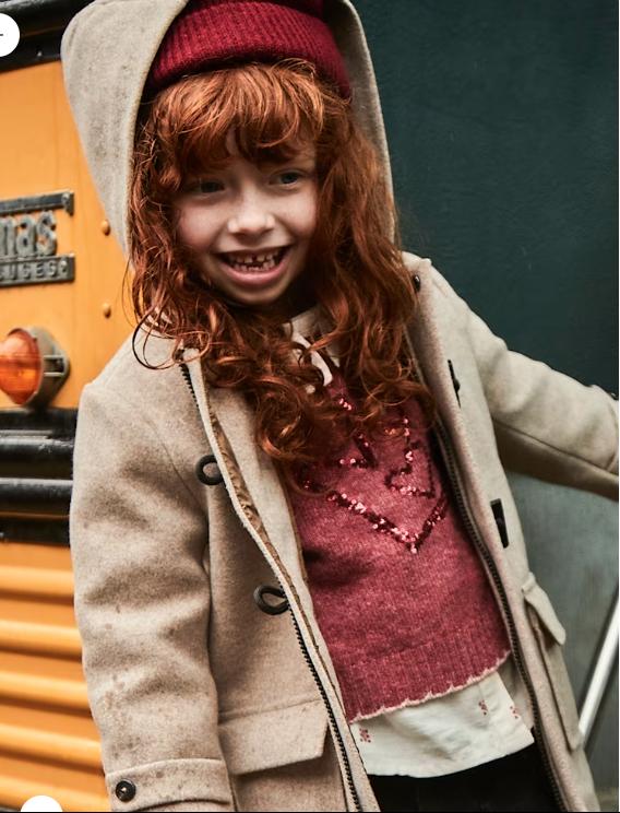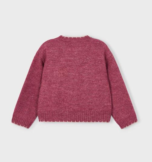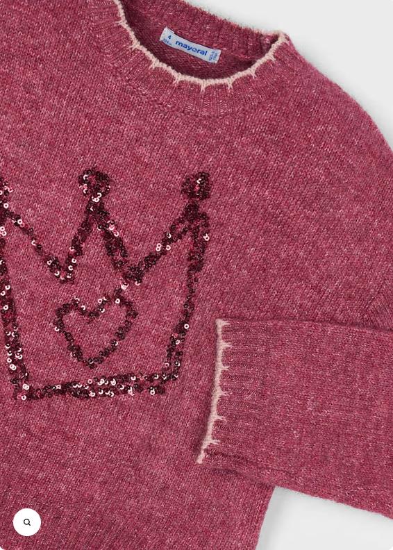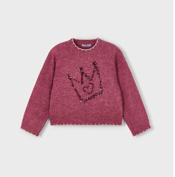Jersey de punto en color cereza , con una corona y un corazón con lentejuelas en la zona del pecho , detalle de ribete haciendo ondas en escote , puños y cintura .