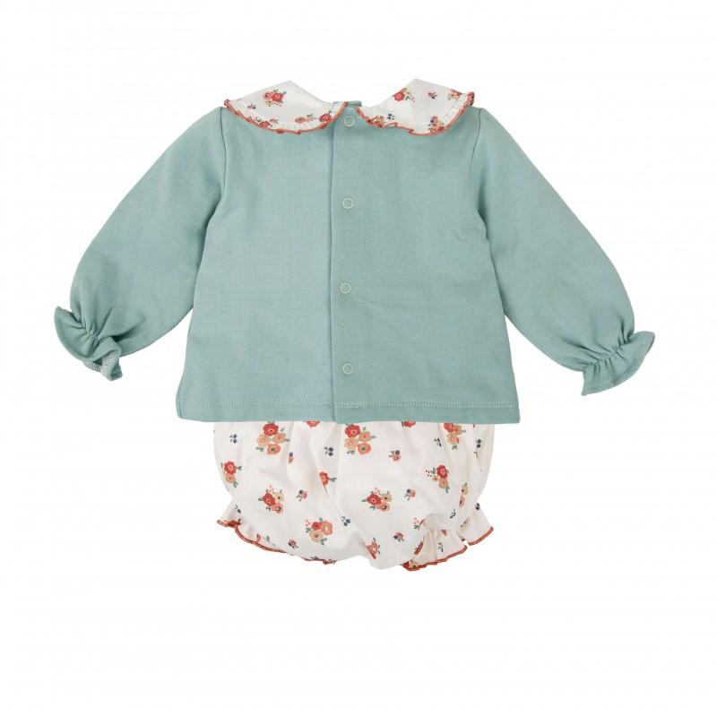 Un conjunto coqueto y lleno de encanto para las pequeñas con estilo desde la cuna. La camiseta de manga larga en suave tono verde agua está decorada con un bordado central de zapato, ideal para las amantes de los detalles dulces. El cuello bebé en tejido floral a juego con el cubrepañal y el delicado ribete ondulado le dan un aire romántico y cuidado.