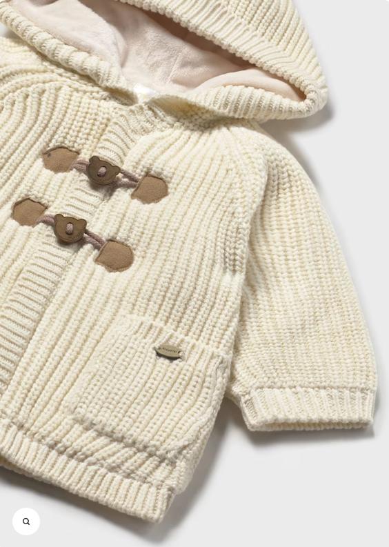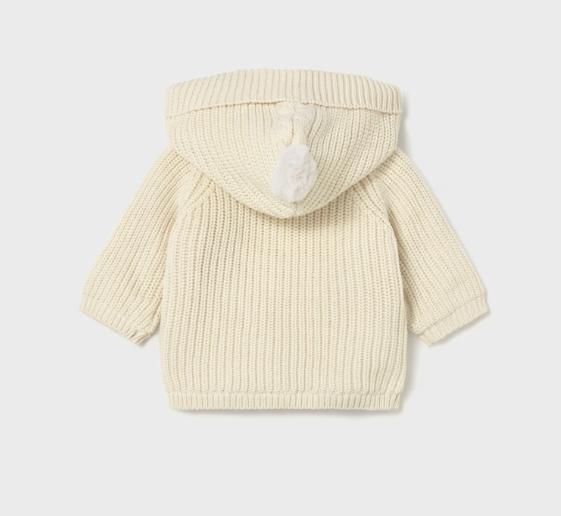 Cárdigan de manga larga para recién nacido. Cuello con capucha. Cierre con cremallera delantera y alamares. Tejido de punto tricotosa de tacto suave y agradable. Bolsillos funcionales en la parte delantera. Elementos de adorno: pompón.
