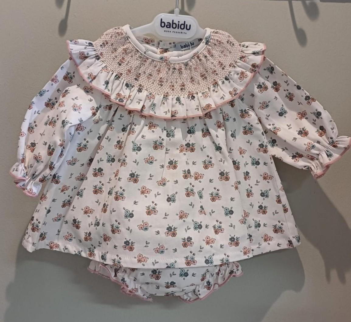 Jesusito de niña de la familia Mahonia de Babidu , confeccionado en tela floral en tonos rosas y verde , manga larga con gomita en el puño, cuello con volante con nido de abeja y con remate igual que puños .Braguita en el mismo estampado .