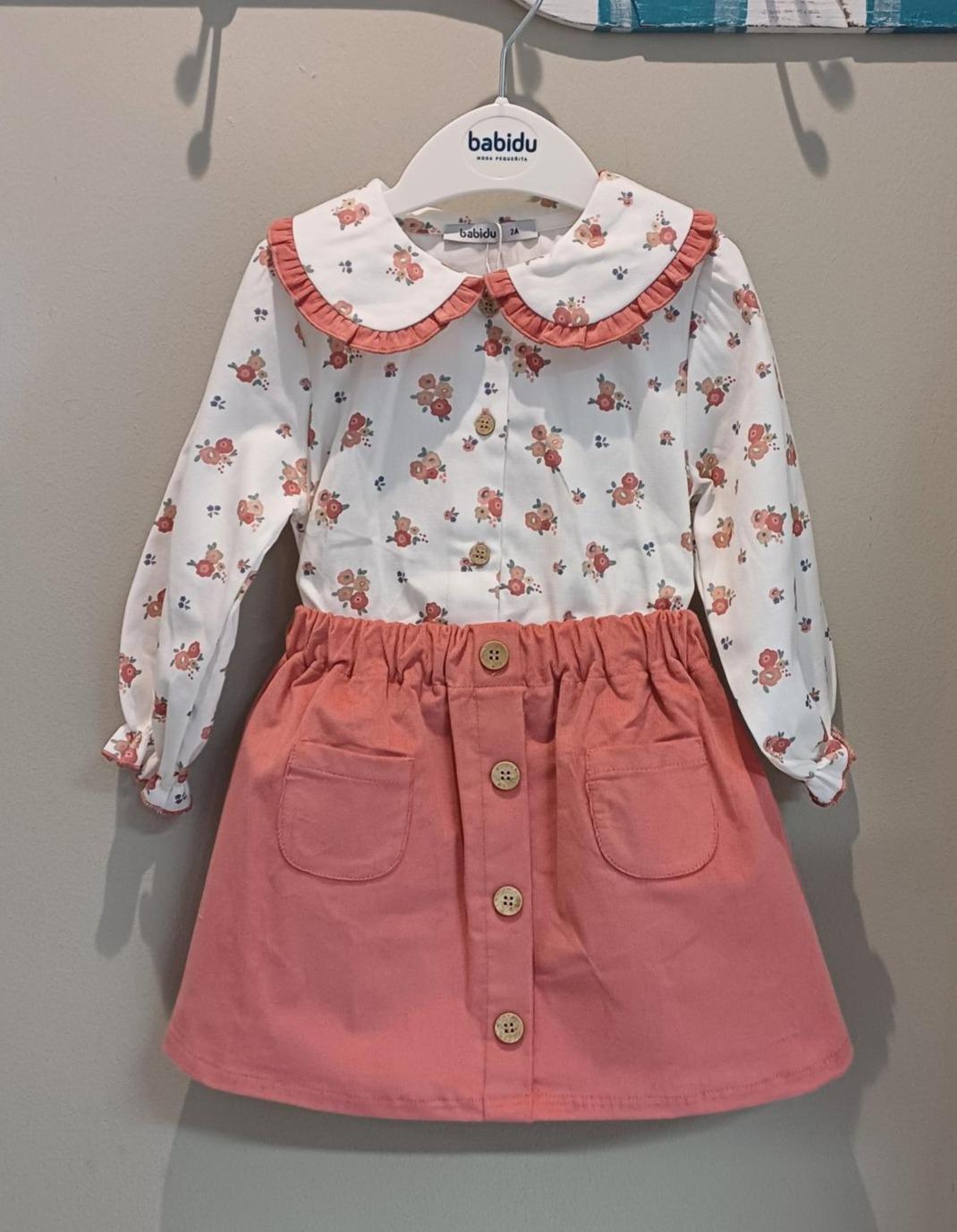 Conjunto de niña de la familia Ambar de Babidu , formado por una camisa estampada de flores en tonos rosas y camel, manga larga con gomita en el puño, dos cuellos redondos con volante en el mismo color que la falda . Cierre delantero mediante botones de imitación madera .Falda de pana fina ,con dos bolsillos en la parte delantera y botones de imitación madera a modo de decoración .Cintura engomada .