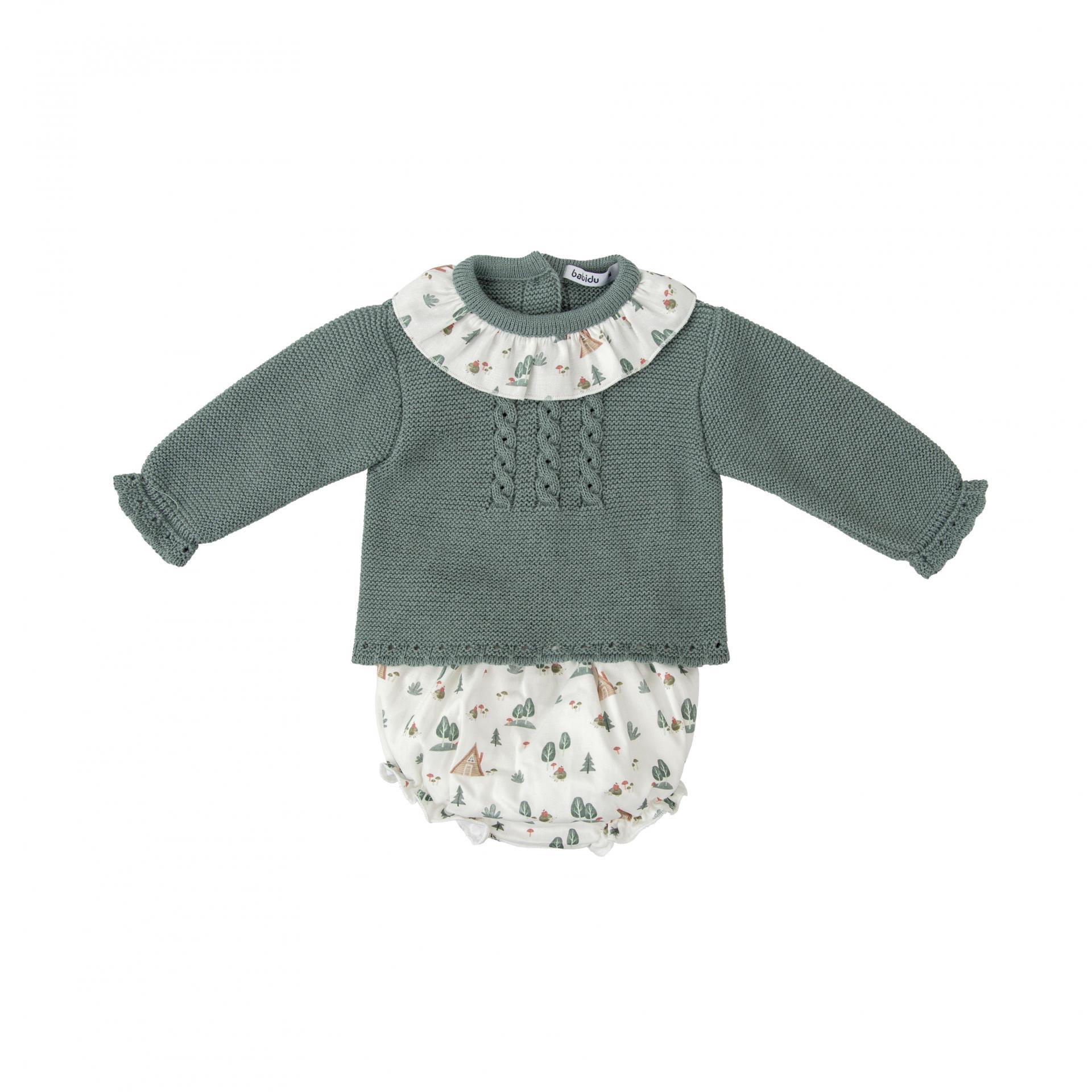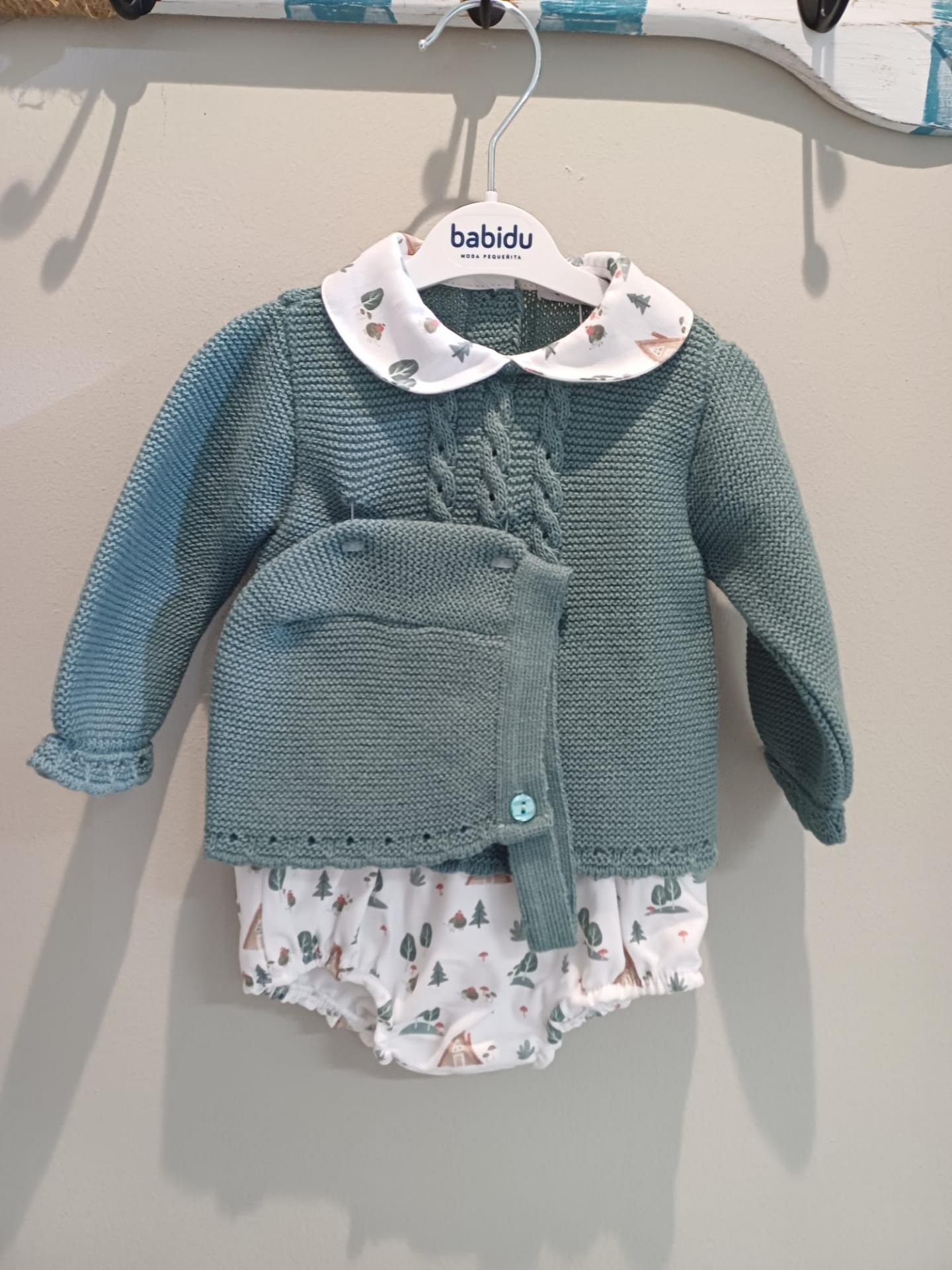 Conjunto para bebé de la familia Fiordo de Babidu , formado por un jersey de punto de manga larga en color verde, detalle de trenzas en la parte delantera y de calado en puños y bajo . Cuellos bebé en tela estampada de árboles . Braguita en tela estampada de árboles en tonos verdes igual que el cuello . Capota en tejido de punto en color verde al igual que el jersey .