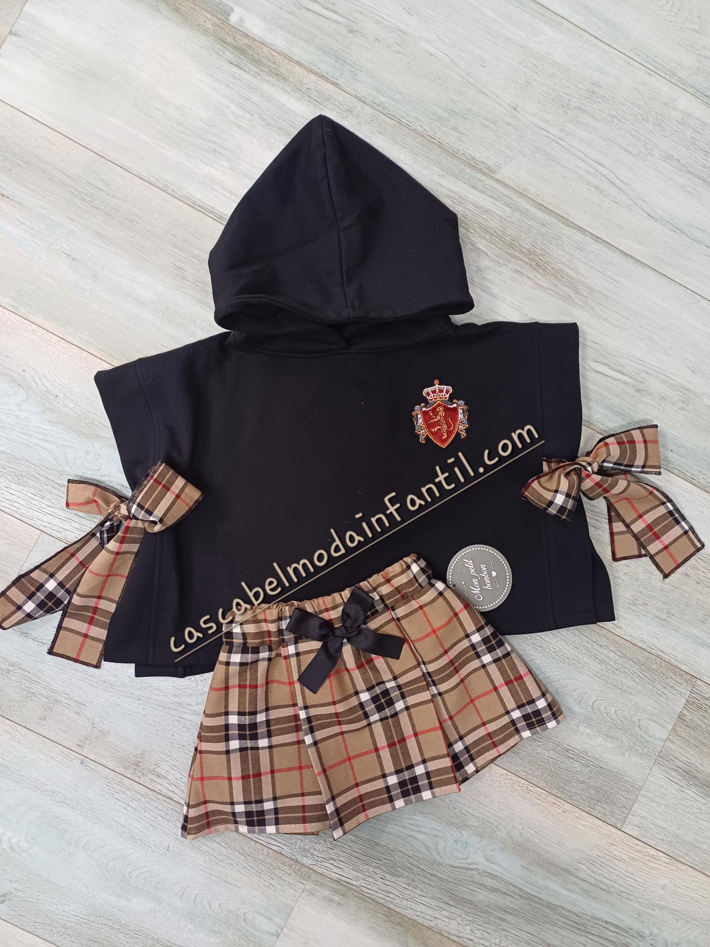 Conjunto de dos piezas formado por una sudadera tipo chaleco en color negro con capucha ,de manga corta y con aberturas laterales con detalle de lazo en tejido de cuadros burberry y parche de escudo en la zona del pecho . Falda pantalón con tabla en la parte delantera , en tejido tartán en camel ,negro , blanco y rojo . Cintura engomada y detalle de lazo en color negro en la parte delantera