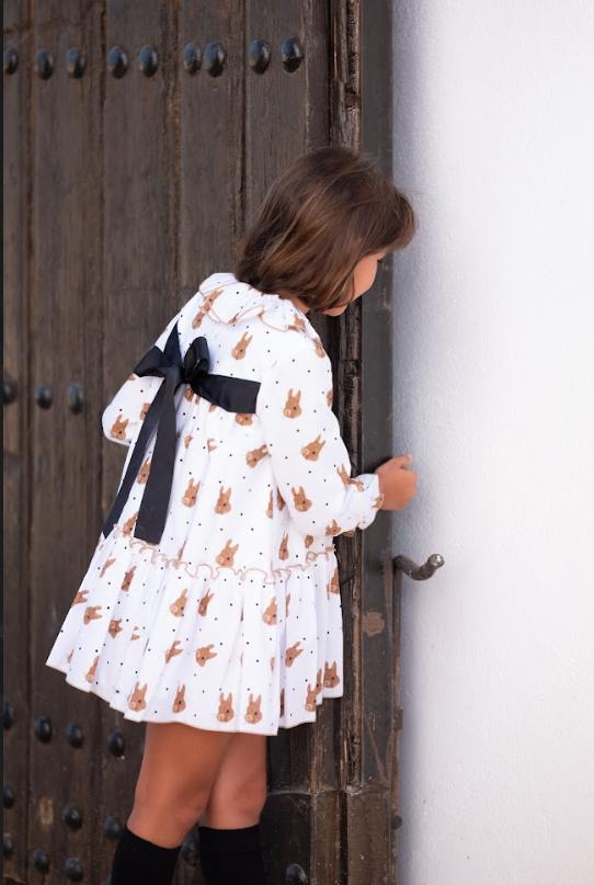 Jesusito de manga larga con goma en el puño que hace efecto volante y talle alto , en tejido blanco con estampado de conejitos en color camel y topos en color negro .Cuello con volante ribeteado en color camel y detalle en el pecho de piculina en color negro . Lazo en color negro en la parte trasera . Braguita en el mismo estampado .
