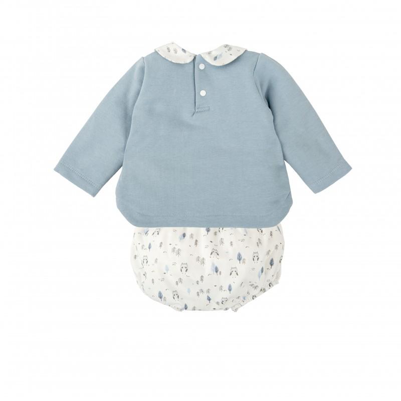 Este encantador conjunto para bebé combina dulzura y comodidad en partes iguales. La parte superior en azul celeste incluye un bordado de búho con carita simpática, mientras que el cuello Peter Pan y el pololo hacen juego con un alegre estampado de árboles y búhos en tonos azules y grises. Ideal para salidas otoñales o como conjunto especial para regalar.