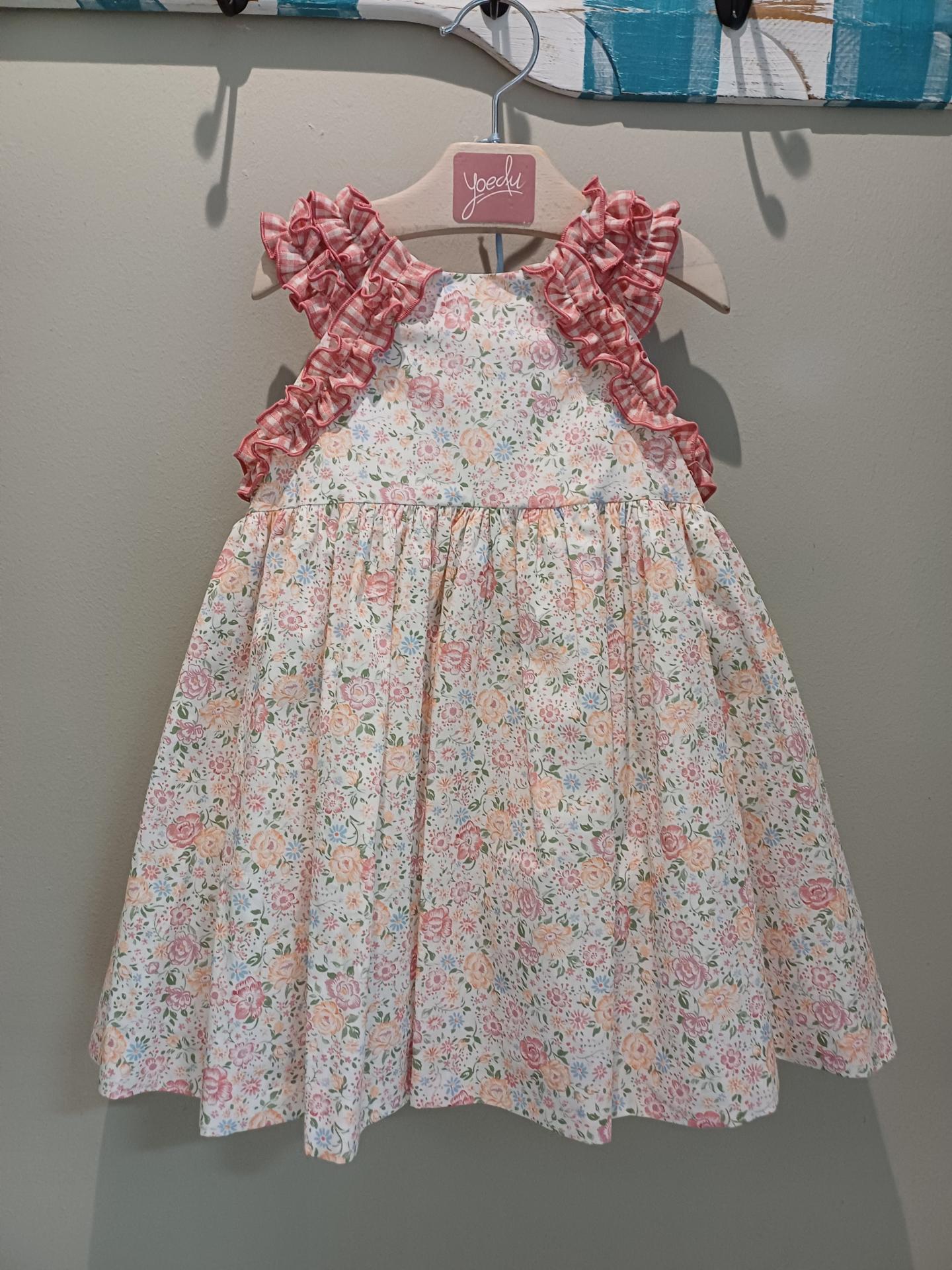 Vestido para niña bebé de la Familia Mayólica de la marca Yoedu ,con estampado de flores en varios tonos . Tirantes con un volante en vichy en coral y blanco , también en la sisa . Lazada en la espalda en un cuadro vichy más pequeño . Cierre trasero con cremallera .