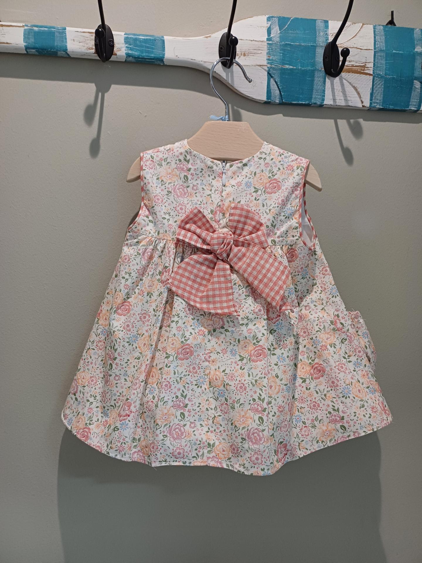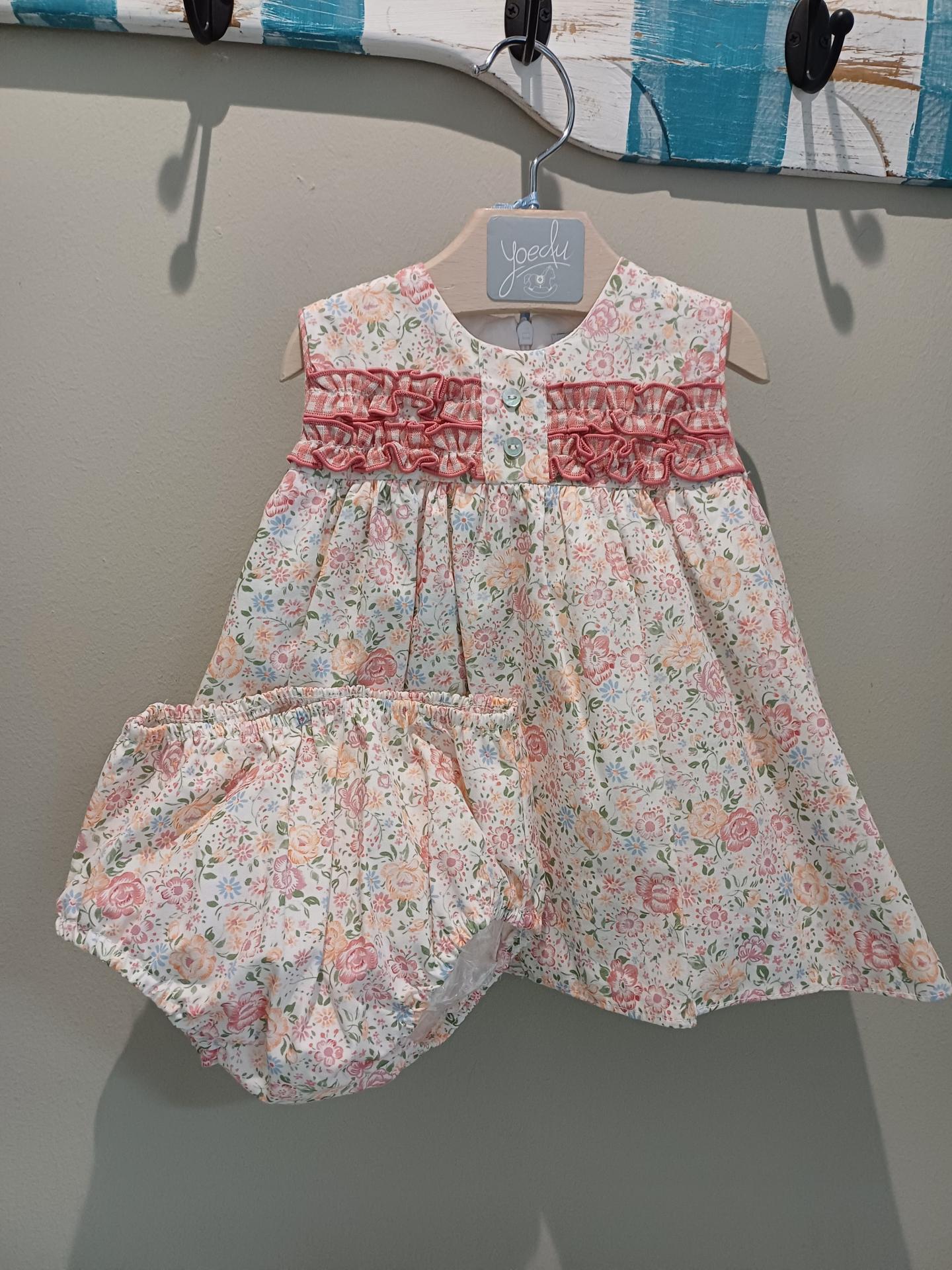 Jesusito para niña bebé de la Familia Mayólica de la marca Yoedu , sin mangas y con escote redondo . En tejido estampado de flores con detalle de volante en vichy coral y blanco en el pecho .Cierre en la parte trasera mediante cremallera . Braguita en el mismo estampado de flores que el jesusito .