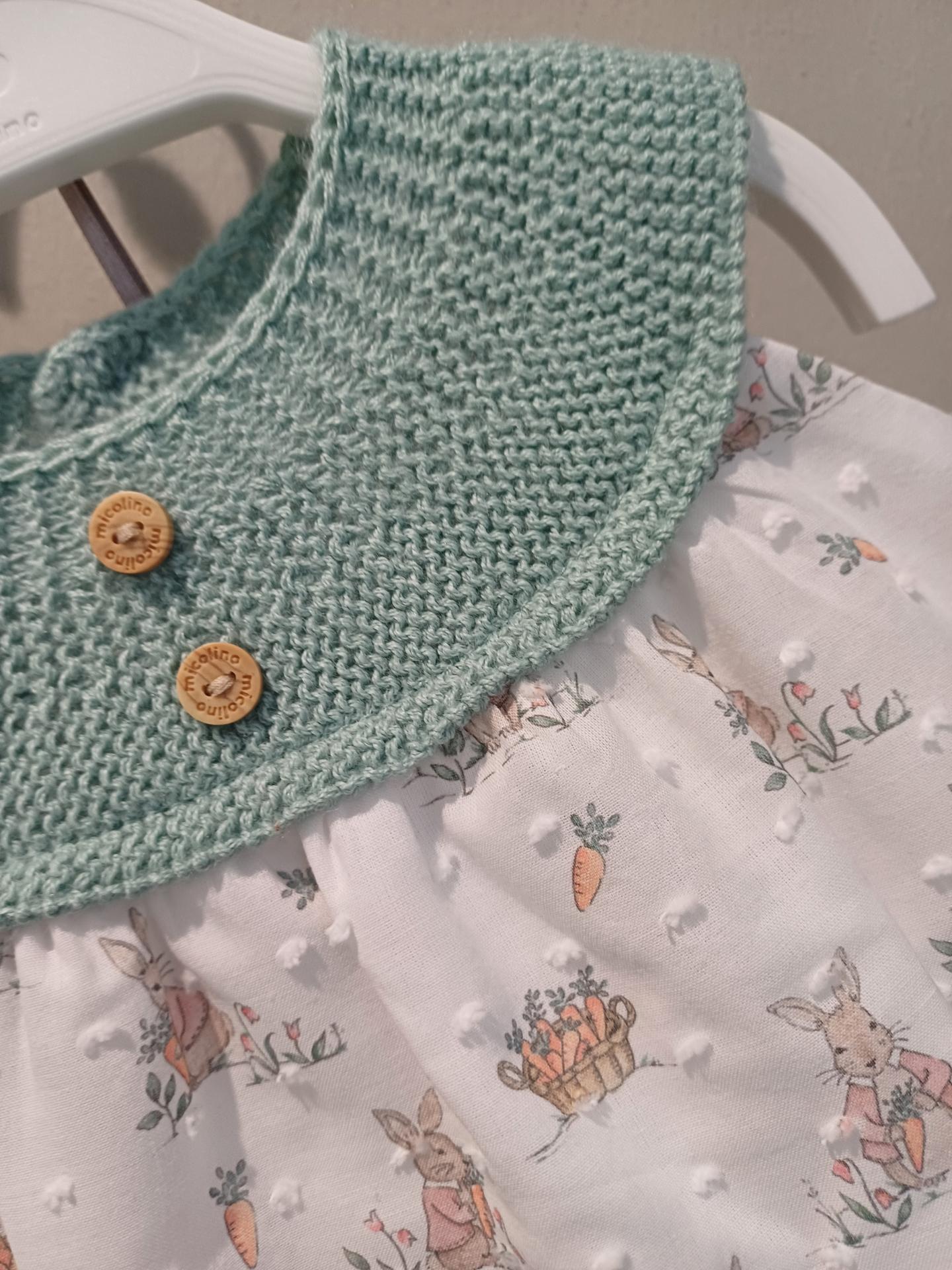 Pelele de la familia Irina de Micolino , sin mangas . Parte de arriba de punto en color verde empolvado , escote redondo y detalle de dos botones imitación madera . Cuerpo en tela estampada de conejos y cestas con zanahorias sobre fondo blanco . Cierre por la parte trasera mediante botones , también botones en la entre pierana para hacer más cómodo el cambio .