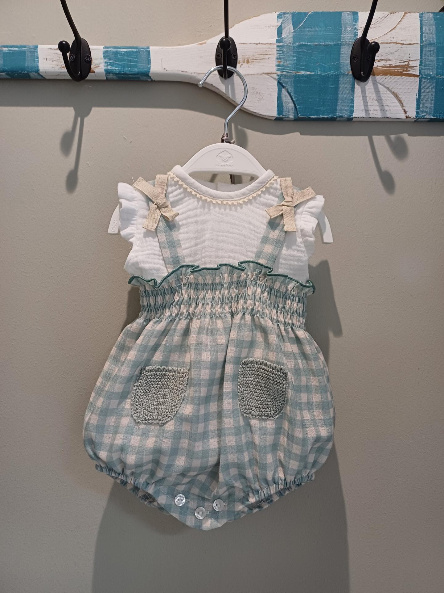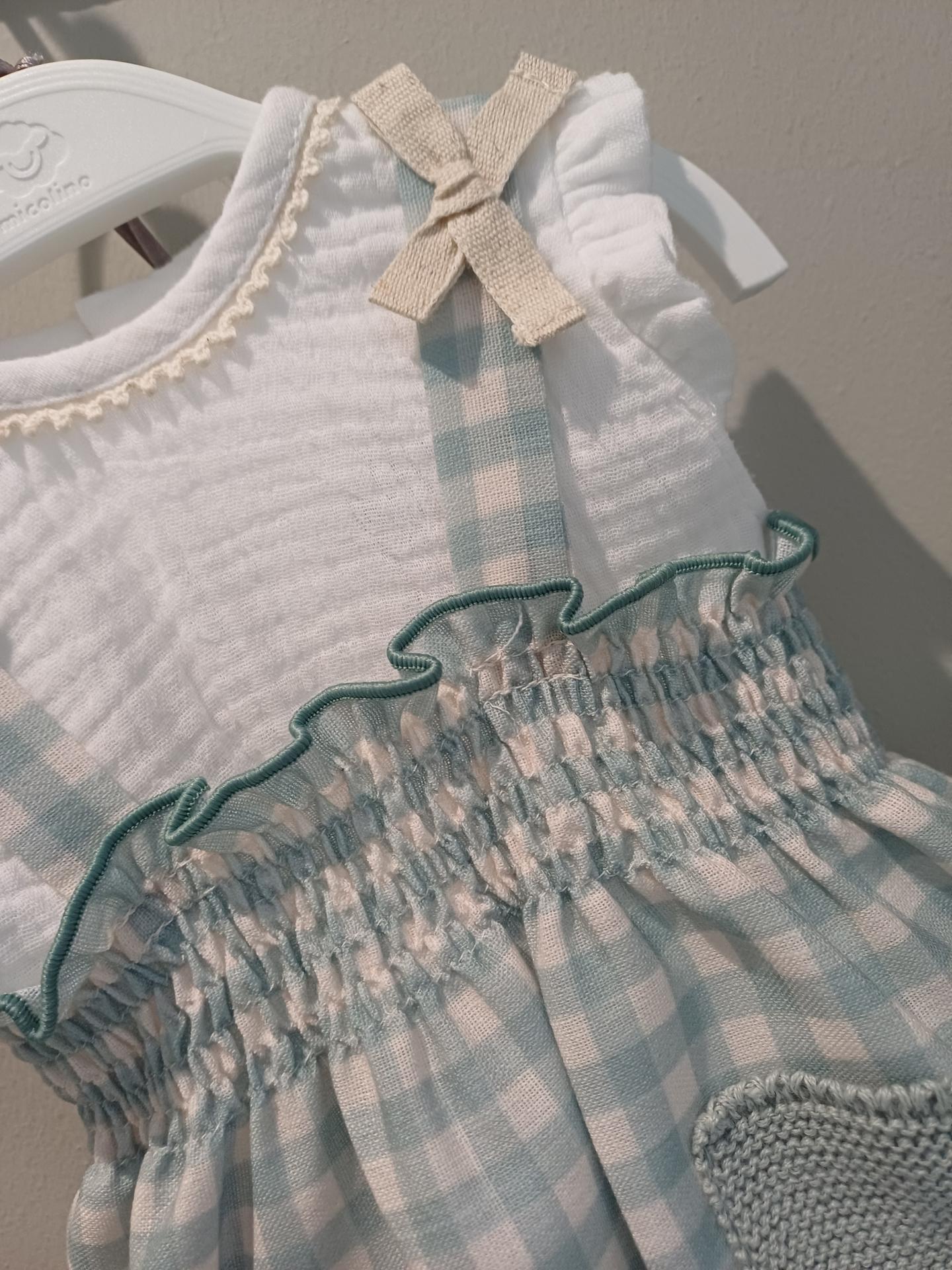 Conjunto de 2 piezas de la familia Nika de la marca Micolino , formado por una ranita en tejido estampado de cuadro vichy en verde empolvado y blanco , goma en la zona de la cintura y tirantes con un lazo en color arena .Detalle de dos bolsillos en la parte delantera en tejido de punto . Blusa en color blanco , en tejido de bambula , sin mangas y con volante en los hombros , en color blanco con escote redondo y detalle de una puntilla alrededor .