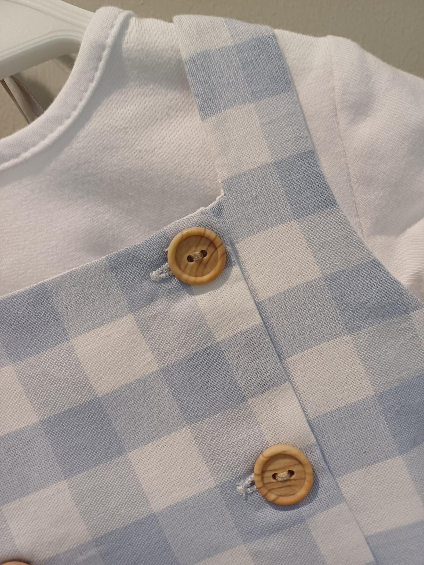 Conjunto de dos piezas de la Familia Tatiana de la marca Micolino , formado por un peto en tejido estampado de de cuadro vichy en celeste y blanco ,con botones imitación de madera en la parte delantera . Camiseta en color blanco en tejido de algodón , de manga corta y escote redondo .