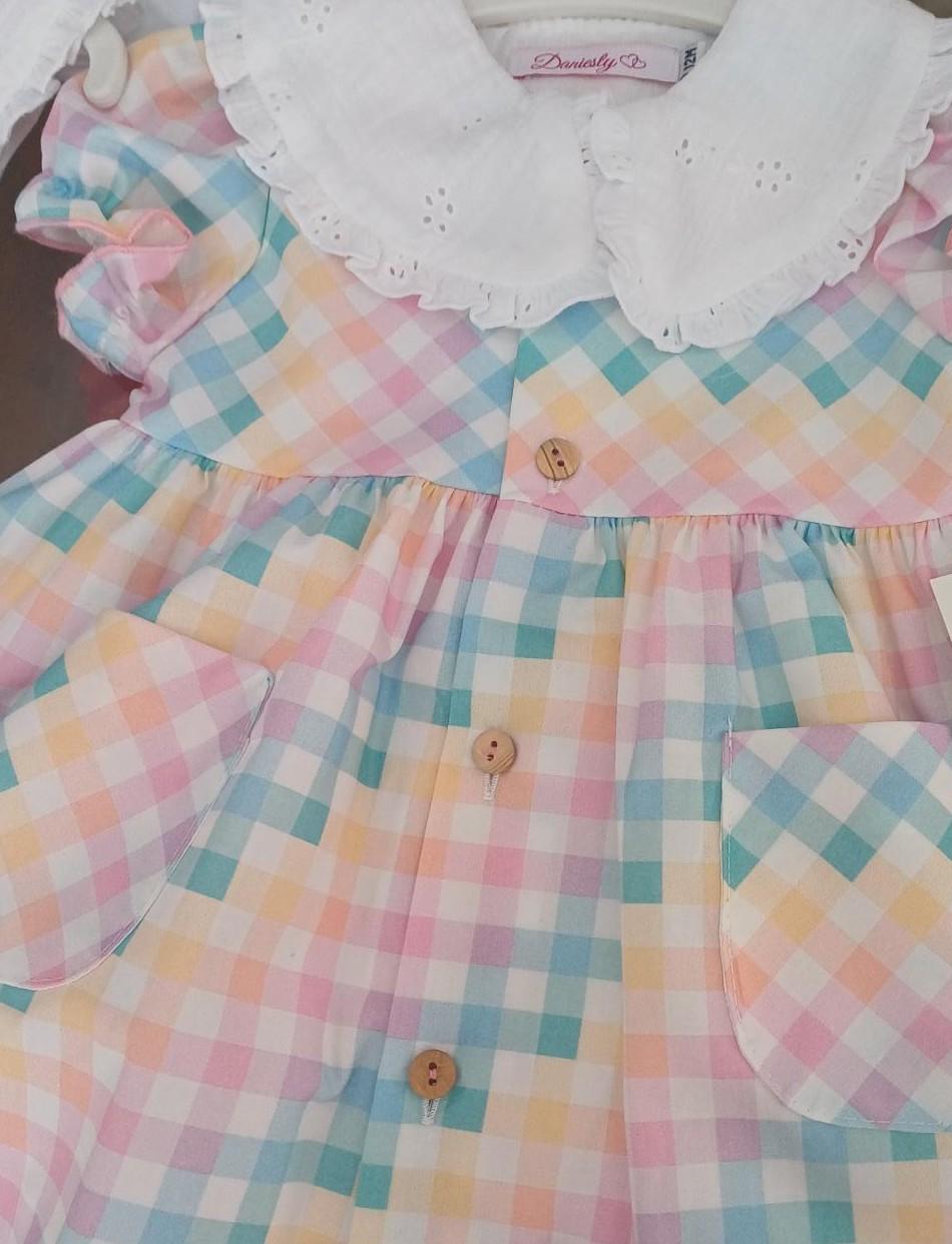 Jesusito de la Familia Ibiza de Daniesty . Jesusito en estampado de cuadros en varios colores , de manga corta abullonada y con cuellos baby doll en tela blanca bordada , detalle de bolsillos en la parte delantera y botones imitación madera . Braguita en el mismo estampado que el jesusito .