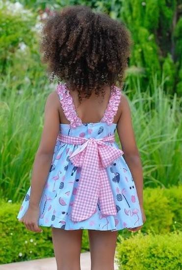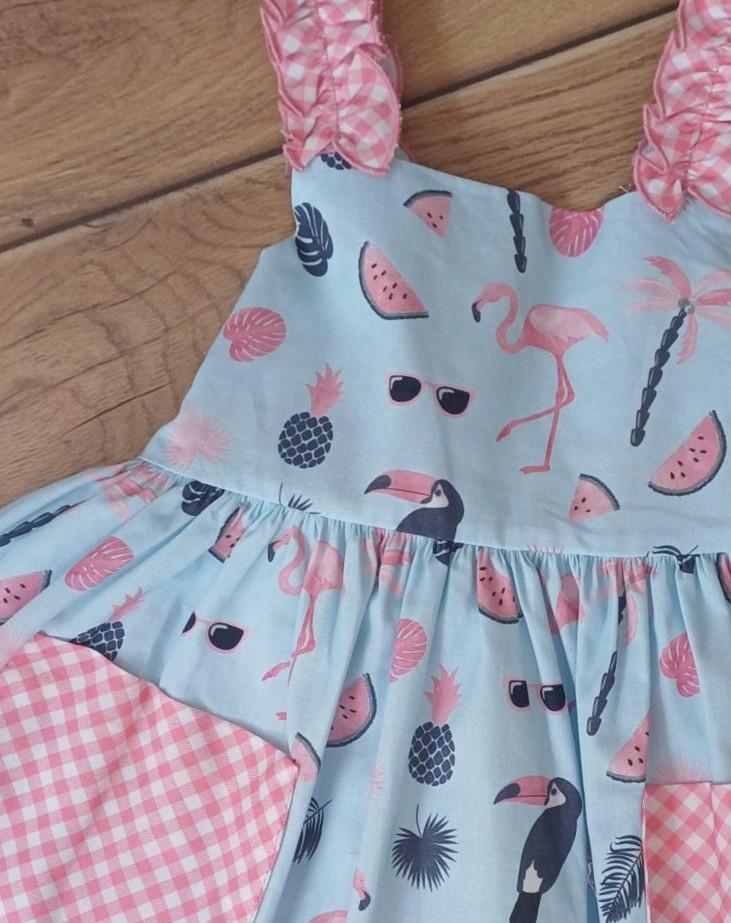 Vestido de la Familia Laguna de Daniesty , confeccionado en tela estampada de flamencos , tucanes , sandías , palmeras ... en color negro y rosa sobre fondo azul . Tirantes en tejido de vichy rosa y blanco .Detalle de bolsillos en la parte delantera en estampado vichy . Lazada en la parte trasera en vichy .