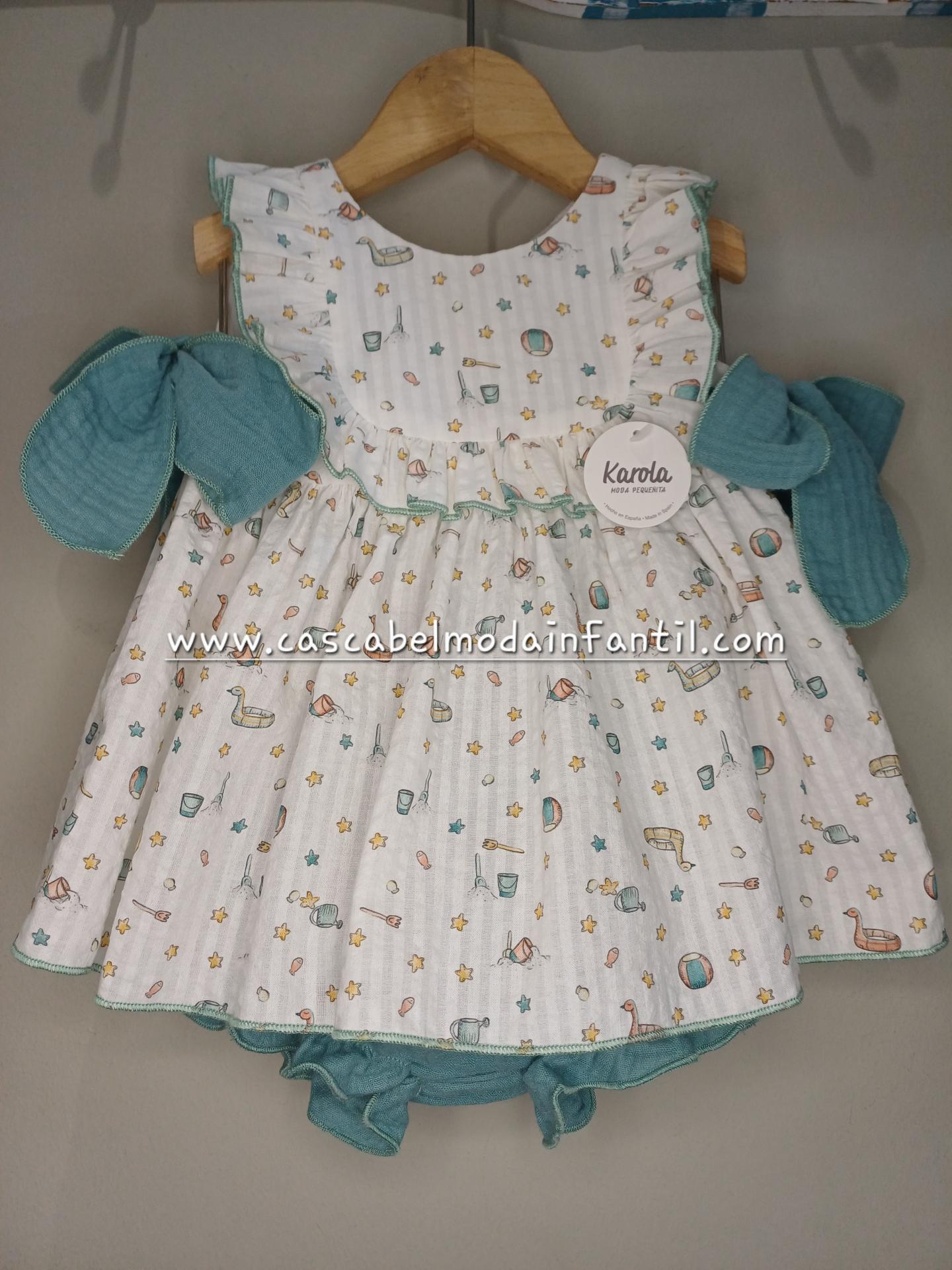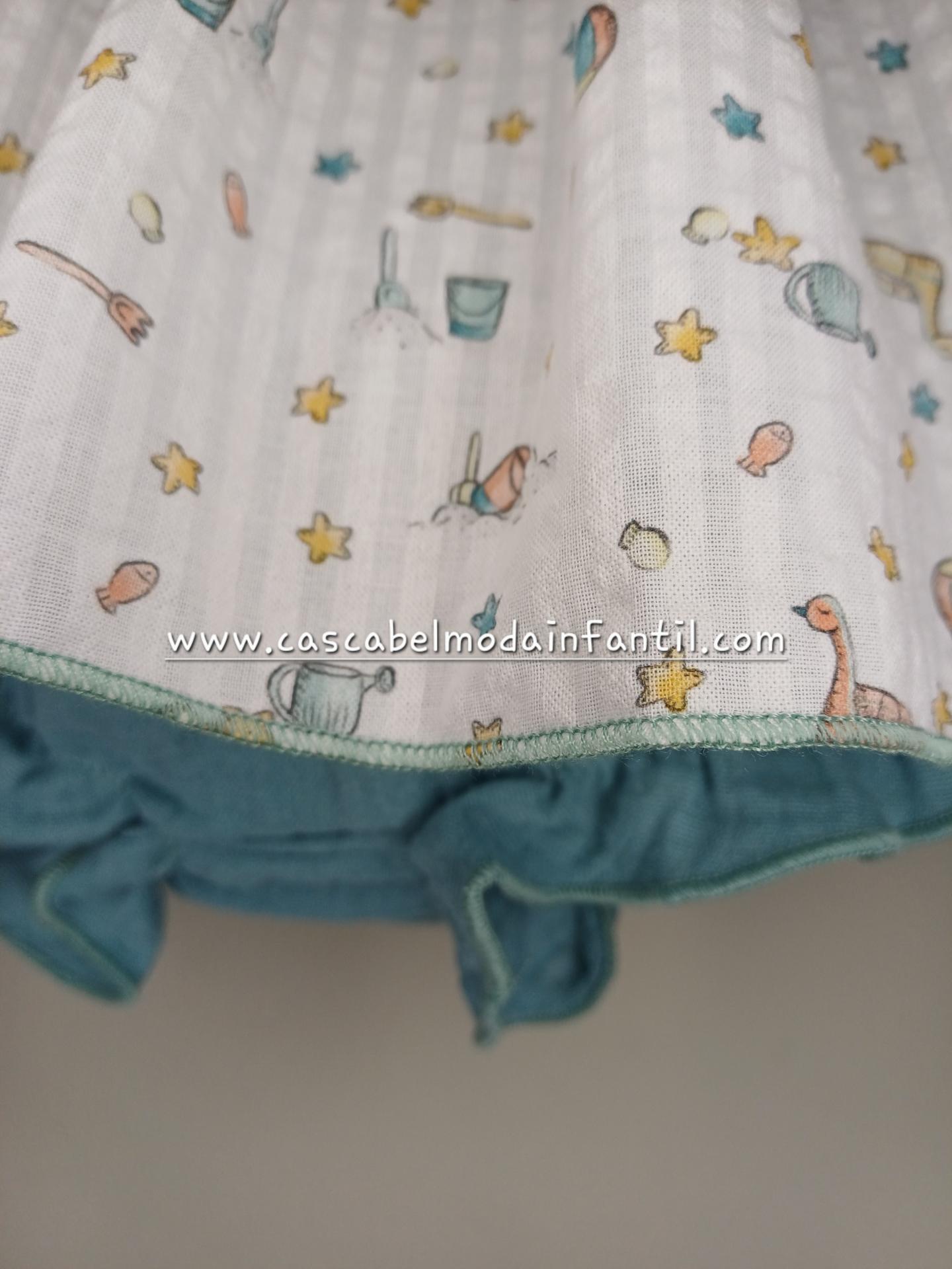 Jesusito de la familia Chispa de la nueva colección para primavera verano de Karola. Confeccionado en una tela de algodón similar a la bambula con un dulce estampado con motivos de playa en fondo color blanco ,volante bordeando el canesú y unos generosos lazos en la cintura de color turquesa a juego con la braguita. Disponible en tallas desde 3 a 24 meses.