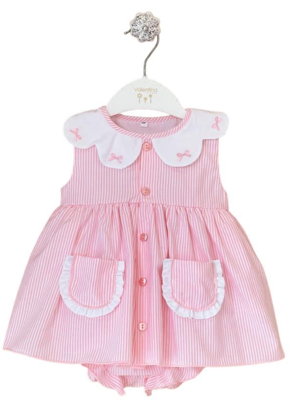 El vestido de bebé que se muestra en la imagen es de la marca Valentina B. (Valentina Bebés), una marca española conocida por su moda infantil delicada y cómoda.