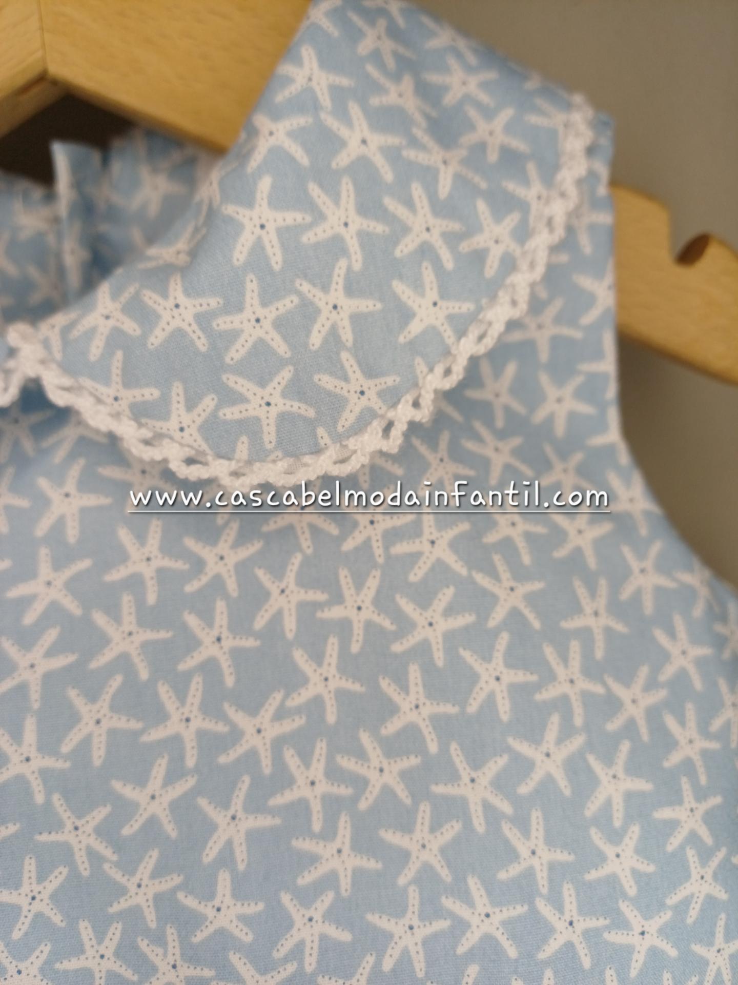 Pelele de la familia Star de la nueva colección para primavera verano de la firma Karola. Está confeccionado en la tela de la colección con la estrellita de mar en blanco sobre fondo celeste. Prenda muy versátil y fresquita para usar en cualquier ocasión. Disponible en tallas 3m, 6 m y 12m.