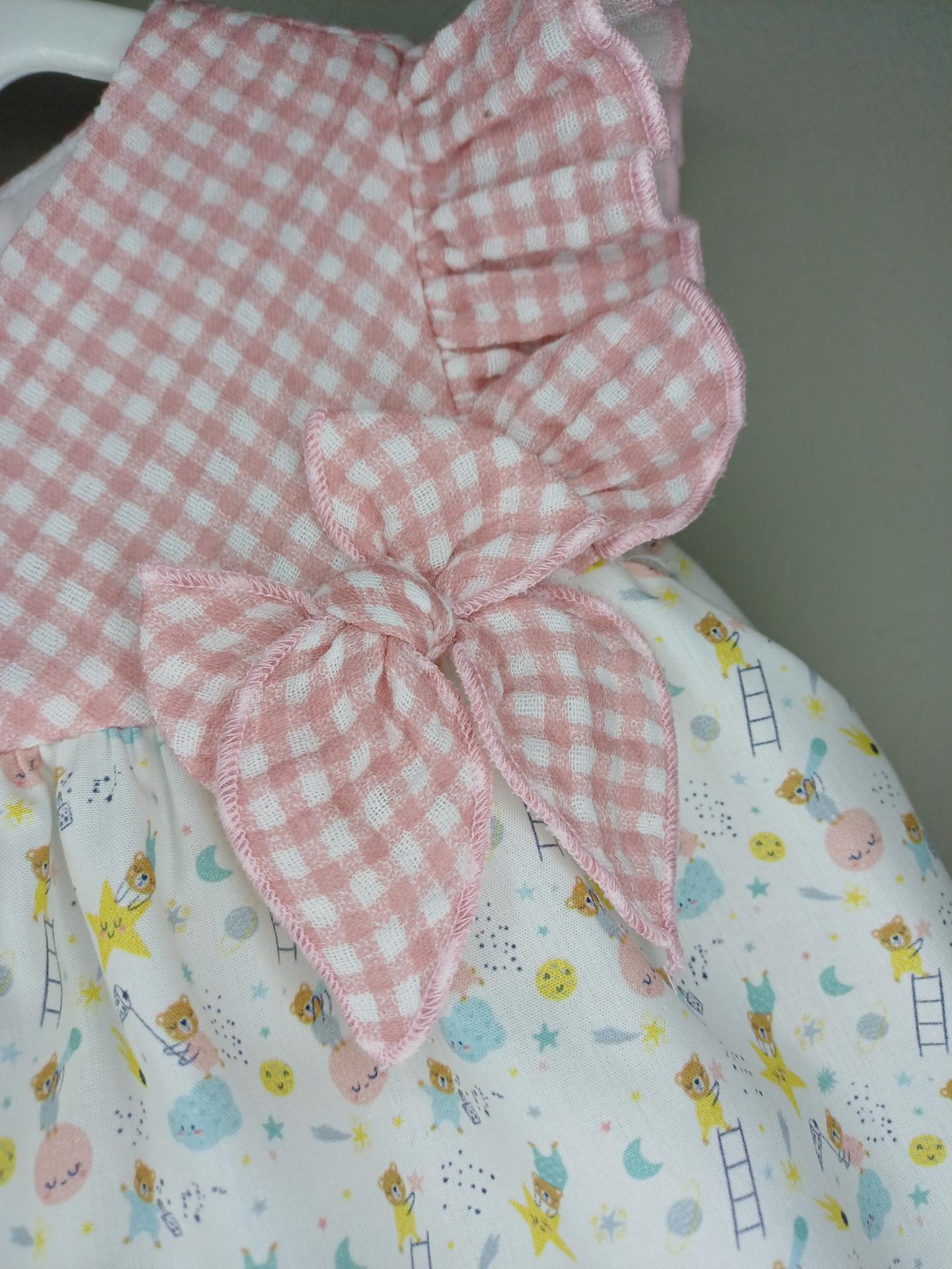 Jesusito de la familia Luna de la nueva colección para primavera verano de la firma Karola. Compuesto de vestidito en una tela con un divertido estampado que combinan con canesú en cuadrito de bichy con aleta en la manga y un lacito en la pechera que le da un aire muy dulce la braguita es del mismo cuadrito