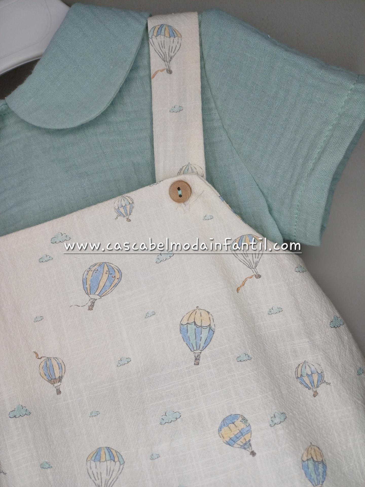 Conjunto de peto con camisa, la tela del peto es similar al lino en un estampado de globos sobre fondo vainilla y el estampado en verde menta , con tirantes y botones en el bajo del peto, la camisa es de bambula verde menta con manga corta y volante en el cuello.