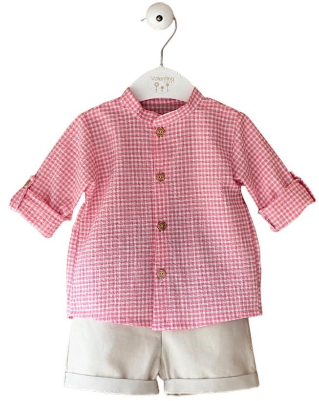 Este es un conjunto de camisa de cuadros vichy rosa y pantalón corto blanco o crudo para niño, de la marca de moda infantil española Valentina Bebés. El conjunto es de colección de verano, de la colección "Petals" . Características del Producto