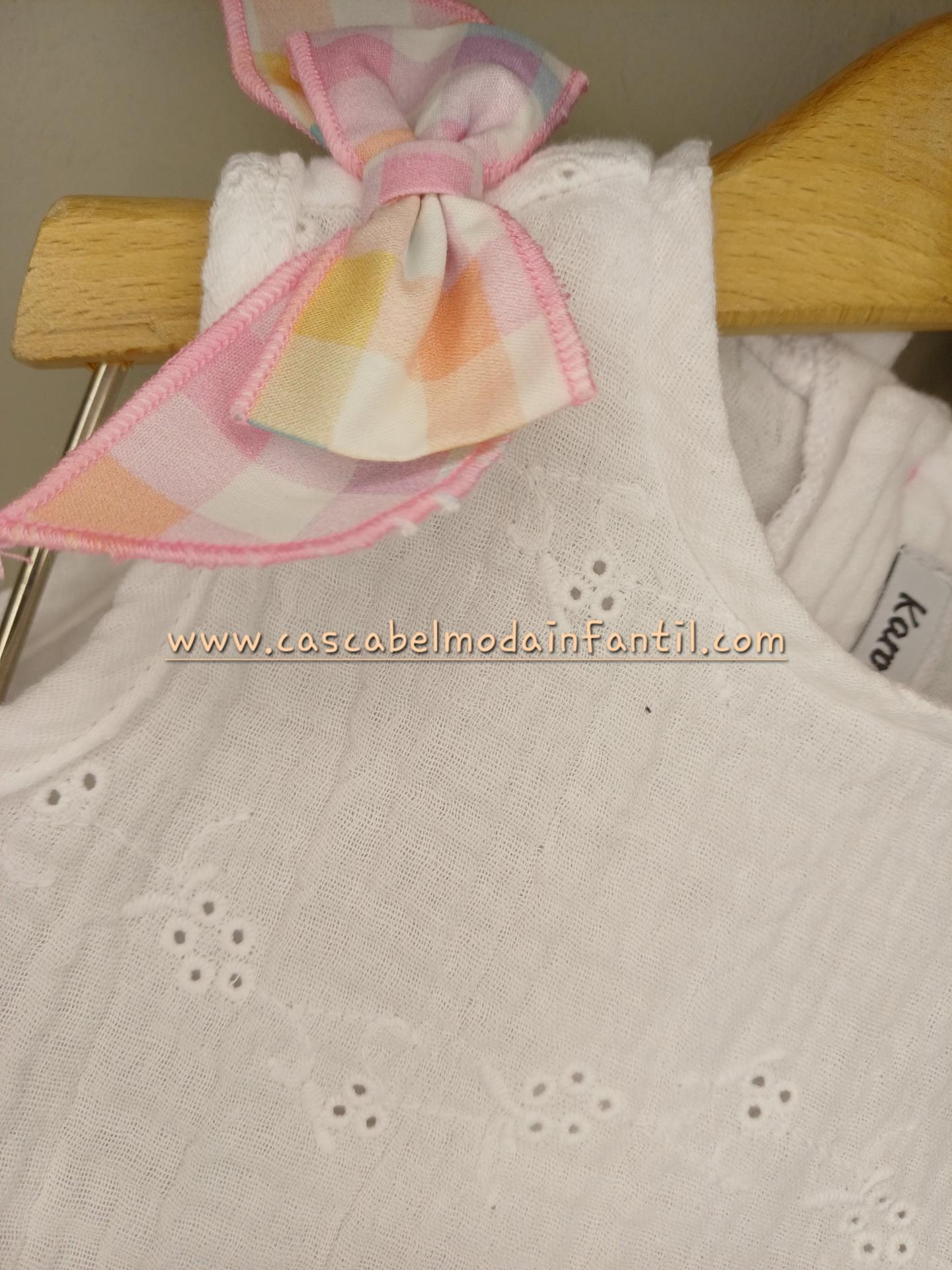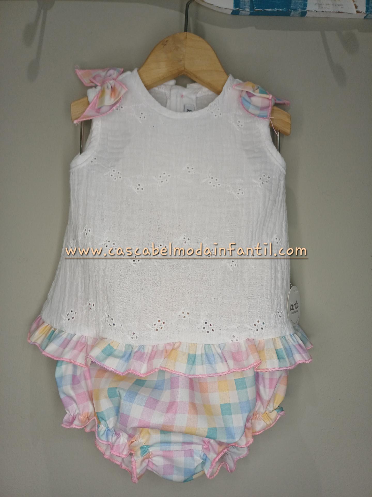 Conjunto de 2 piezas compuesto de camisa blanca de bambula perforada cuello a caja, sin manga y lacito en el hombro de cuadritos de la colección, volante en el bajo y braguita a juego , conjunto muy fresquito para los días de calor.