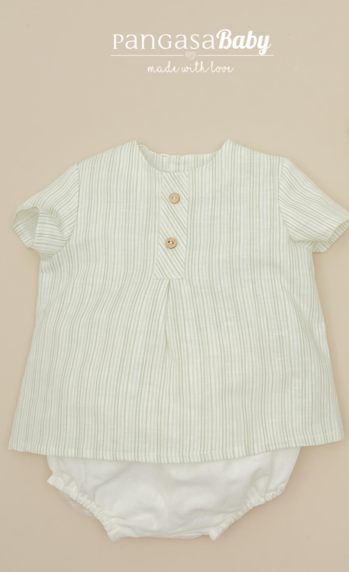 Conjunto de camisa de rayas verde hoja y ranita blanca de tejido de algodón fresco para tu bebé. Para que tu compra sea perfecta aquí tienes la Guía de tallas de Pangasa Baby: