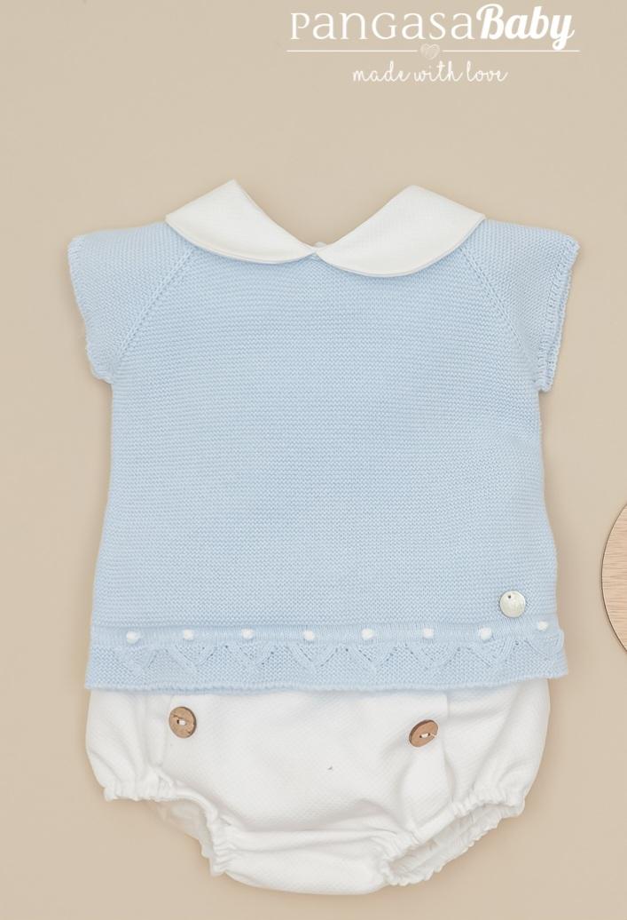 Conjunto de 2 piezas formado por jersei de manga corta en color celeste, con cuellos bebé en piqué blanco y ranita blanda de piqué con adorno de botones de madera. Para que tu compra sea perfecta aquí tienes la Guía de tallas de Pangasa Baby: