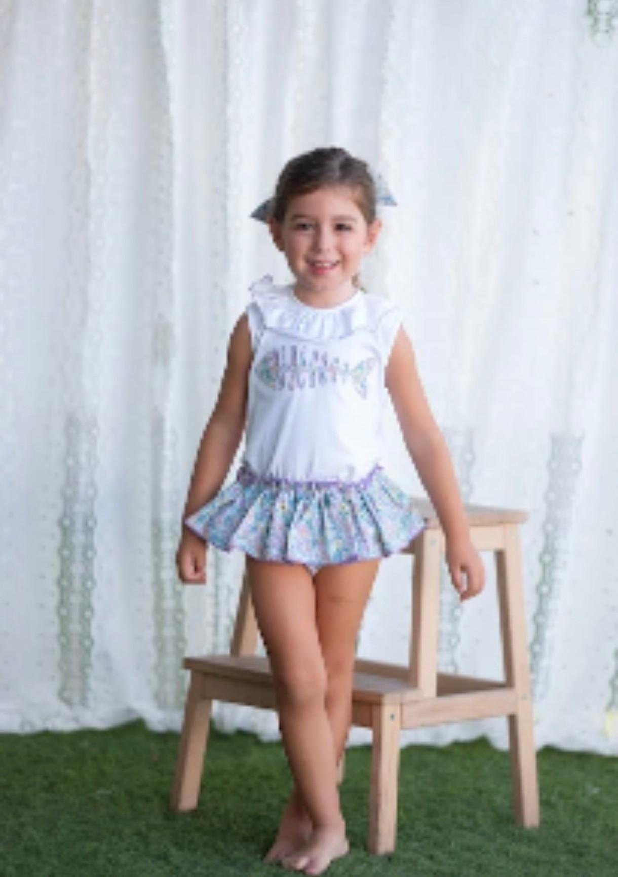 Camiseta de algodón blanco de la colección raspa liberty de la firma Mon Ptit Bobon. Manga a sisa, apertura trasera, lleva un volante en el escote con rulito en lila . Lleva un sobrepuesto de Raspa bordado en la parte frontal de la camiseta en la tela liberty de la colección. La combinamos con la bragafalda de estampado liberty en tonos lila, verde, amarillo....