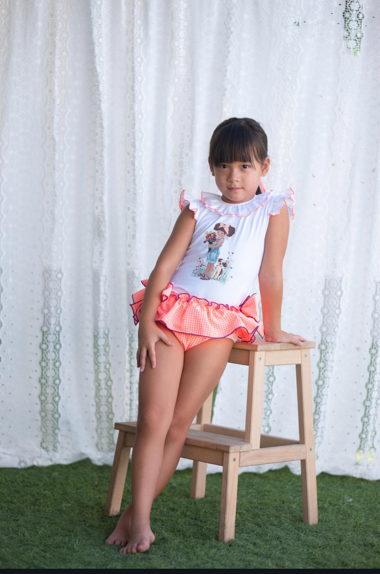 Conjunto de niña de la firma Mon Petit Bonbon. Colección flores y vichy naranja fluor. Se compone de camiseta de algodón blanco con apertura trasera para un fácil manejo de la prenda, escote a caja adornado con un volante de la misma tela reviteado en el color naranja fluor de la colección al igual que la aleta de la manga, en el frontal de la camiseta lleva una bonita serigrafia de niña con flores. la combinamos con la braguita de la cuadros de vichy en naranja fluor.