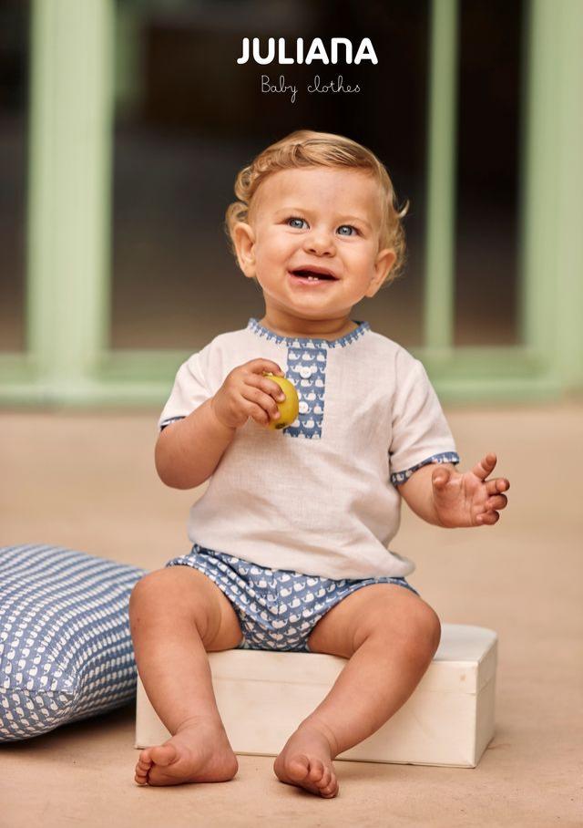 Conjunto para niño de la firma Juliana Vistiendo Bebés. Se trata de un conjunto de camisa más bombacho. El conjunto incluye una camisa de manga corta en color blanco roto con un detalle de tira de tela en la abertura del escote y en los bordes de la manga de una bonita tela estampada de ballenas a juego con la ranita.
