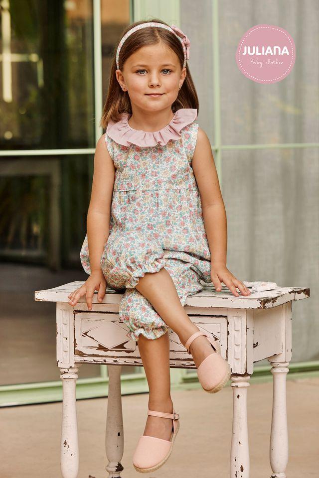 Mono o peto infantil con estampado floral de estilo liberty, fabricado por la marca española Juliana. Se trata de un mono largo con un estampado de flores pequeñas en tono pastel, característica de los diseños de la marca. Destaca su cuello con un volante de color rosa, tirantes anchos y puños elásticos en los tobillos para un ajuste más cómodo. Tejido de algodón o mezclas similares ideales para primavera verano por su transpirabilidad.