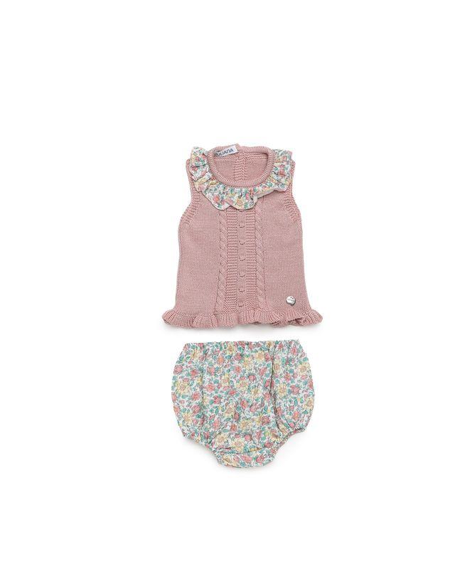 Conjunto para bebé niña de la marca Juliana Vistiendo bebés, perteneciente a la colección de primavera verano. El diseño destaca por su estilo clasico con detralles románticos. La pieza superior un jersey de puto sin mangas confeccionado en hilo. Presenta un cuello de volante de tela estampado floral y un remate de volantes en el bajo. La pieza inferior es una braguita o bombacho fabricada en tela con el mismo estampado de flores que el cuello.
