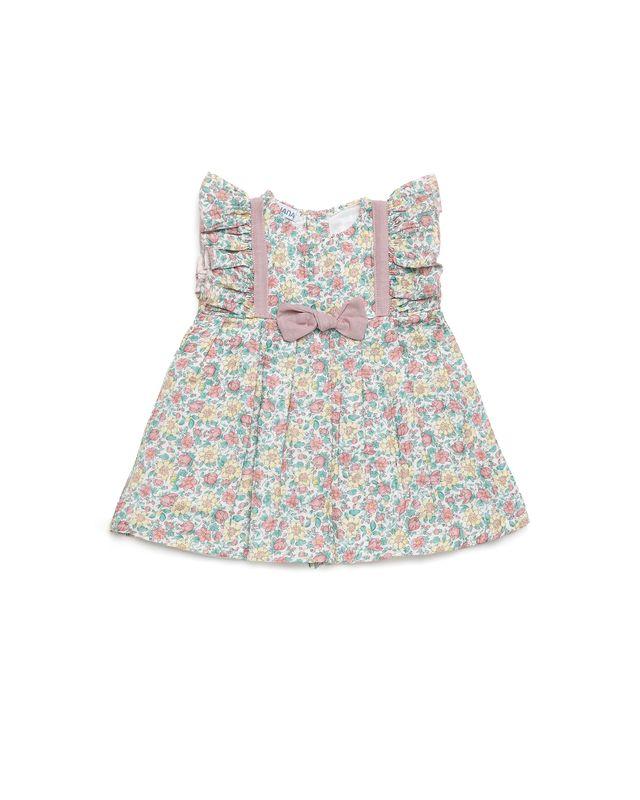 Vestido con estampado floral multicolor( tonos rosa, amarillo y verde). Presenta detalles de volantes en los hombros y un lazo decorativo en color rosa empolvado en el pecho.
