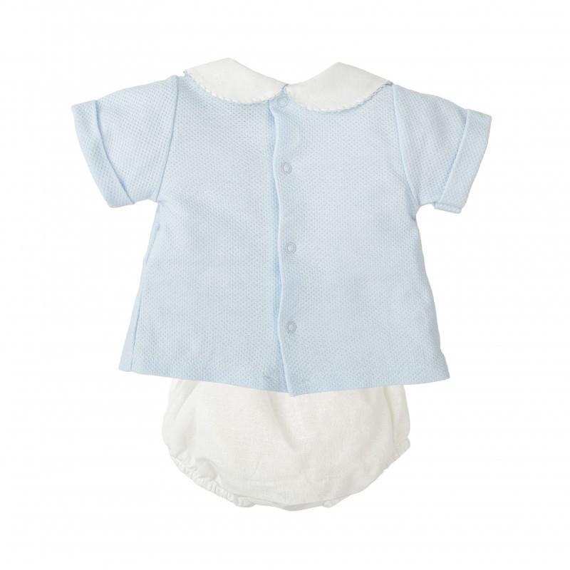 Conjunto de bebé compuesto por camiseta en tono celeste y cubrepañal en color blanco, confeccionado en suave tejido de punto ideal para los primeros meses. Un conjunto clásico y elegante que combina comodidad y estilo para el día a día del bebé.